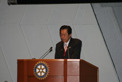 | 李RI会長エレクトは「MakeDreamsReal〜夢をかたちに〜」のテーマを掲げられ、過去何年間にも及んで継続されてきた奉仕の強調事項である 水、保健と飢餓救済、識字率向上 に対する取り組みを引き継ぐことを宣言されました。 そしてこれらの分野に光を当て、世界の子供たちのすさまじい死亡率を低下させ、将来への希望とチャンスを子供たちに与えることによって、彼らの「夢をかたちに」していくのだと力強く説明されました。 また、このことは発展途上国の課題にとどまらず先進国に於いても本質論としては変わらぬものとしてとらえ、足元の地域社会へ目を向けることは私たちの使命であると話されました。 私共のテーマ「次の世代にときめきを」を実現するためのまちづくりと相通ずるものを感じ心強く思った次第です。RIの期待に応えるべく努力をしたいと思います。 (1)クラブ奉仕部門 会員増強はロータリーの存亡をかけた最重点課題です。李RI会長エレクトは純増1名を基本的な目標とされた上で各クラブ10%の増強は推奨目標として設定されました。当地区としては各クラブ純増1名を昨年に引き続き目標といたします。魅力あるクラブ運営は会員増強と共に退会防止にもつながります。共に力を合わせ目標を達成することが、ロータリーの発展につながることを胸に力強く前進しましょう。 (2)職業奉仕部門 職業奉仕は、他の多くの奉仕団体と我がロータリーを際立って識別する最大のモメントとされています。正に金看板であり、ロータリアンのパスポートの裏書でもあります。さてご高承の通り1905年ポールハリスによって創始された当初のロータリークラブは、親睦・助け合いから始まりました。その後ハーバード・テーラーの実証したロータリーの行動規範である四つのテストが定められました。そしてロータリーの行動哲学であり、公式標語となっているフランクコリンズの「超我の奉仕」そして第二標語であるアーサー・シェルドンによる「最もよく奉仕する者、最も多く報いられる」とする行動哲学が提唱され、今日に至っています。 この2つの標語について、私は常々「陰徳善事」と「陰徳あれば陽報あり」の2つの格言に読み換え、洋の東西を問わず人の志すところは一つであることに深く感銘いたして居ります。 職業奉仕はロータリアンの基本的条件であり、ここで改めて何をすべきかを申し上げる必要はないでしょう。しかし世間に目を向けますと、余りにも職業道徳(企業倫理)の欠落した事件の多いことに驚きます。 このことは同時に社会は今こそ真のロータリアンの出番を待っていると言っても過言ではないのです。ロータリアンの真価を発揮されんことを祈ります。 (3)社会奉仕部門 ロータリーの根幹である職業奉仕の精神に基づいて、広く外に向って奉仕活動を展開しようとするのが、この社会奉仕部門であります。 当地区では、各クラブそれぞれがその所属する地域社会の自然環境や文化そして歴史的背景や人的風土を反映し、多岐に亘る活動を実践して居られることを承知しています。今後共私たちの子孫にときめきを覚えるような環境を残すことを念頭に、死に甲斐のある終の栖の実現を目指し奉仕活動にお励み下さい。そして今一つDDFの活用などを通して世界に私達の輪を広げようではありませんか。 (4)国際奉仕部門 a.ロータリー財団について ロータリーの世界平和に資する奉仕活動の最大の手立てがロータリー財団への協力であることはご高承の通りです。昨年に引き続き全てのロータリアンが年間160ドルの寄付を行うことを目標と致します。またクラブに所属される会員全員が160ドル以上寄付された場合にはガバナー特別賞を差し上げることも同じです。 b.米山奨学事業について この奨学会は日本独自のものであり、世界に冠たる奨学会であります。日本で学ぶ外国人奨学生が我が国に対する理解を深め、やがて帰国されることは世界に於ける日本の位置づけを確立すると共に日本の文化を世界に広め、日本に対する世界の理解を深める上で最も大切な事業であります。このため、当地区は例年通り一人当たり24,000円を次年度目標と致します。 (5)青少年奉仕関係 次年度地区テーマである「次の世代にときめきを」をストレートに反映していただける奉仕活動がこの青少年部門であります。敢えて多くを語りません。思い切り活動の翼を広げられ皆様の死に甲斐をかけて次の世代の為にときめきを残してあげてください。ご期待申し上げます。 (6)RI強調事項について a. 水保全について 安全な水がないことが直接間接の理由となって、毎日6,000人にも及ぶ5歳未満の子供の命が失われていることを考えるだけで、この課題の重要性がうかがわれます。水の汚染を防ぎ、安全な水の利用ができるよう各プロジェクトを支援することに注力して下さい。 b. 保健と飢餓救済について 命を失う子供たちの殆どの原因が予防可能な病気であり、また一方では栄養失調によるものです。水保全と同様